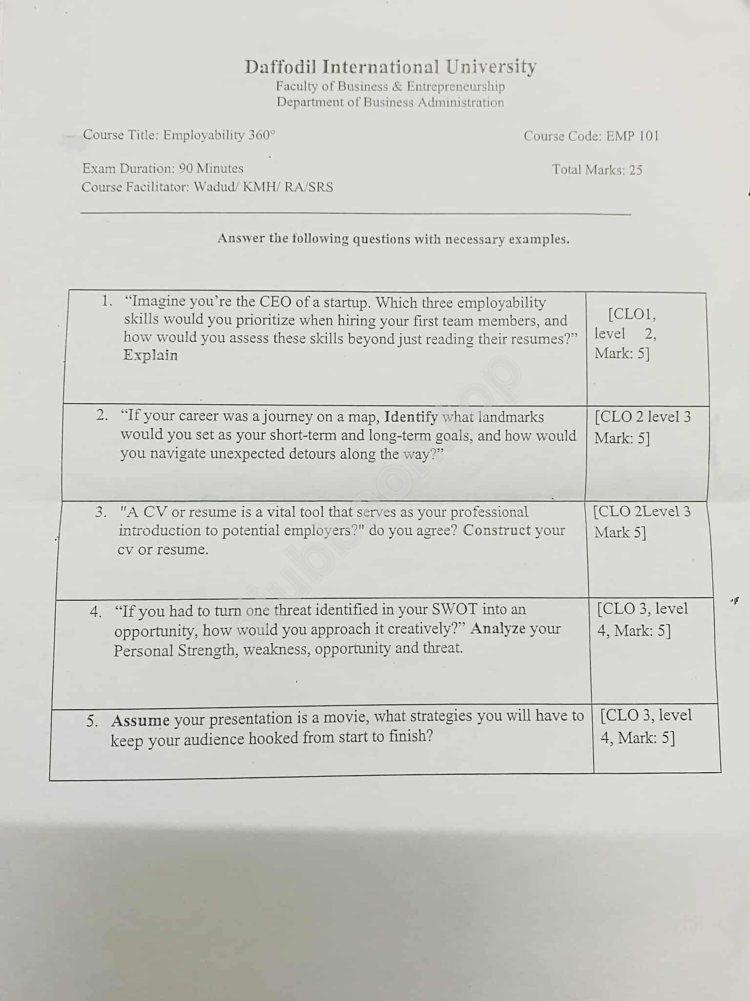You can download Employability 360 – Unknown – Midterm for Employability 360 (EMP 101) from the DIU BBA Archive. This question is from the Unknown, Batch .