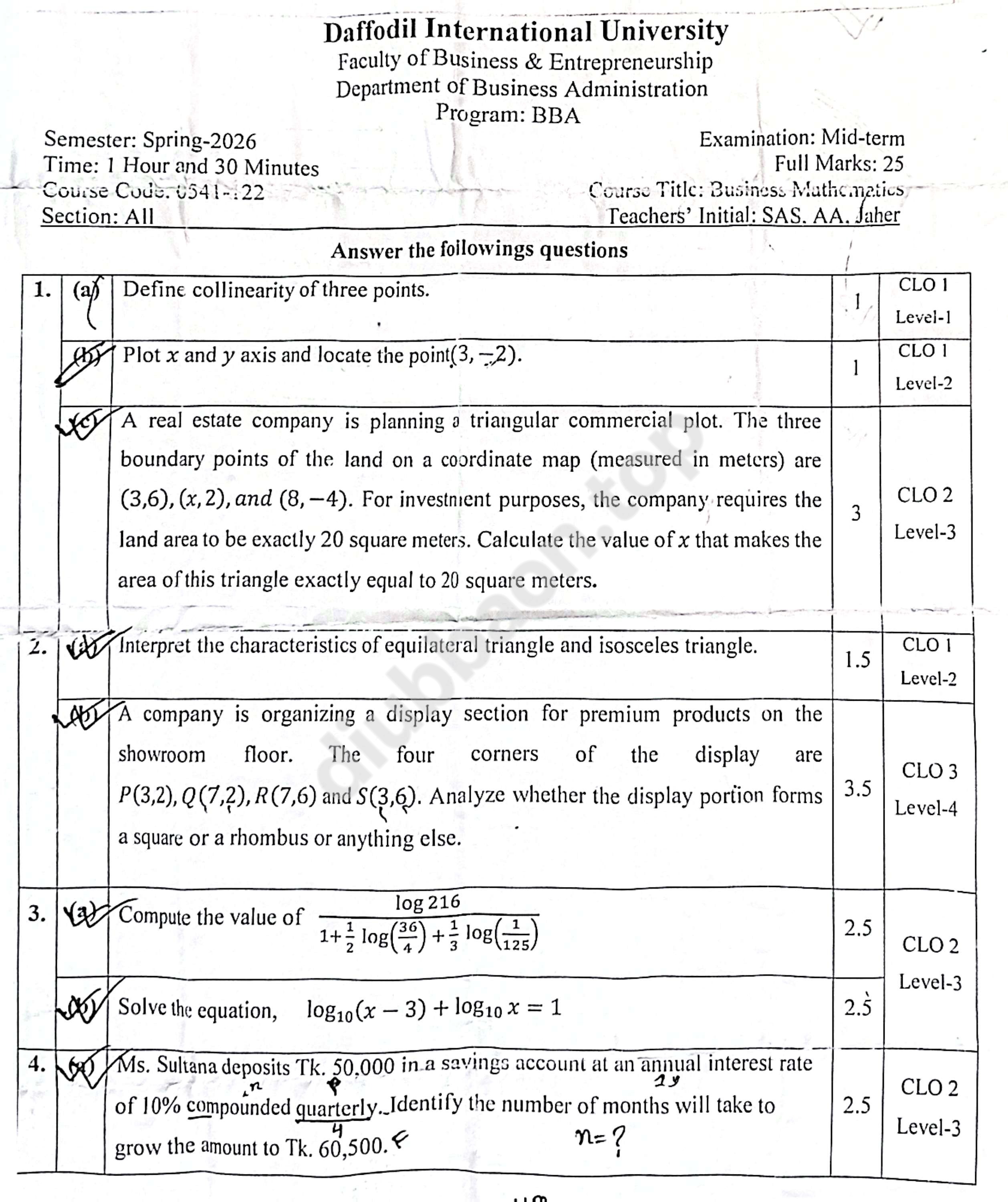 You can download Business Mathematics – Spring 2026 – Midterm for Business Mathematics (0541-122) from the DIU BBA Archive. This question is from the Spring 2026, Batch BBA 70.