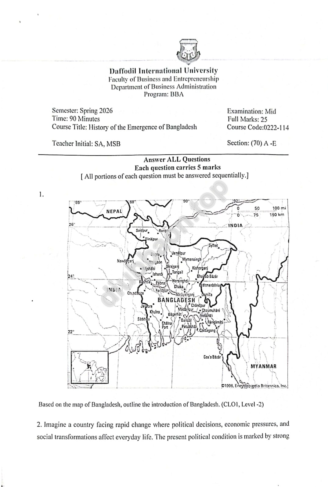 You can download History of the Emergence of Bangladesh – Spring 2026 – Midterm for History of the Emergence of Bangladesh (0222-114) from the DIU BBA Archive. This question is from the Spring 2026, Batch BBA 70.