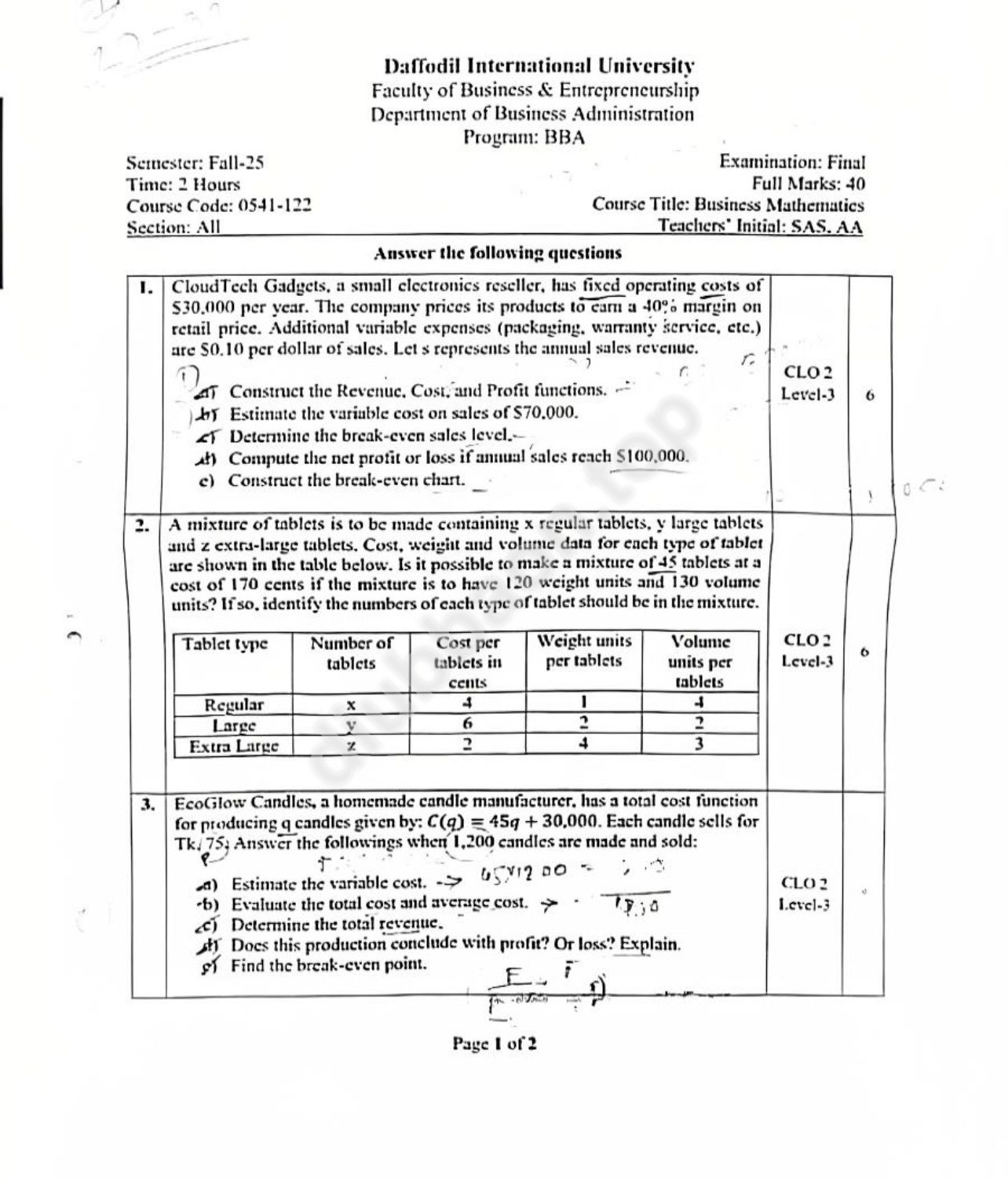 You can download Business Mathematics – Fall 2025 – Final for Business Mathematics (0541-122) from the DIU BBA Archive. This question is from the Fall 2025, Batch BBA.