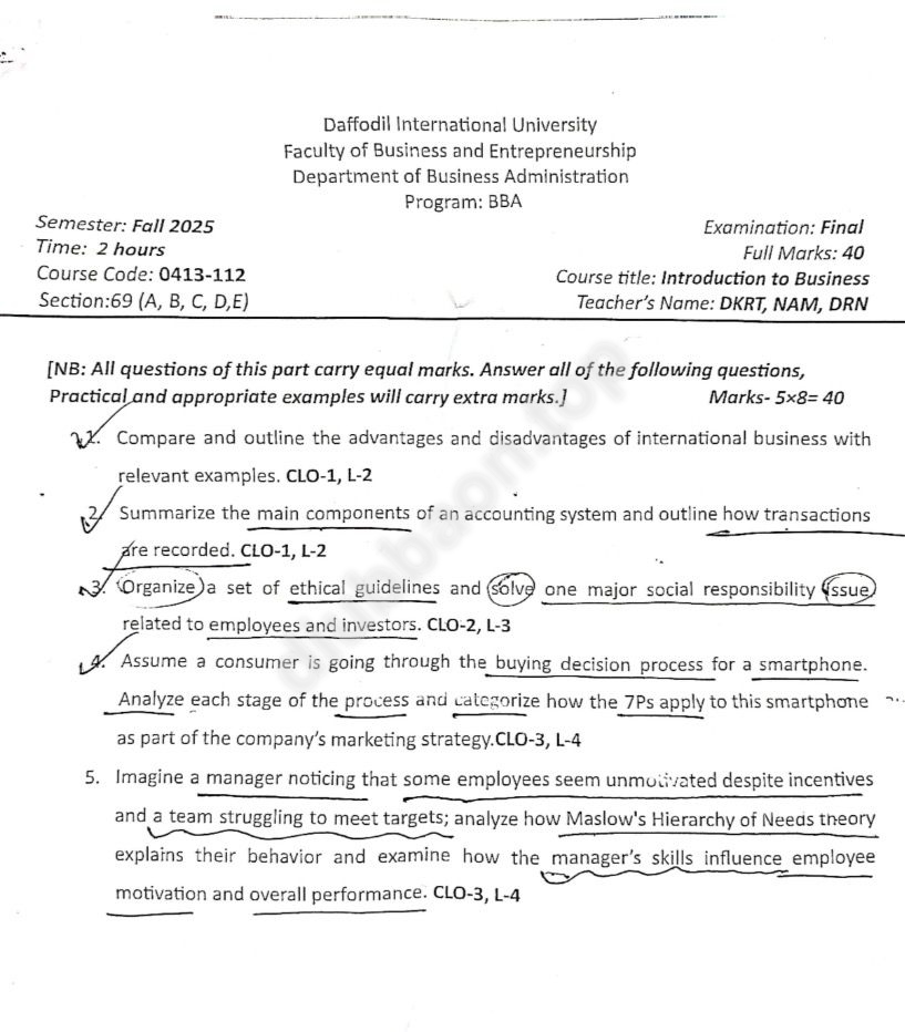 You can download Introduction to Business – Fall 2025 – Final for Introduction to Business (0413-112) from the DIU BBA Archive. This question is from the Fall 2025, Batch BBA 79.